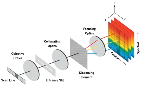 Line-scan cameras collect data as a single, one-dimensional row of pixels. To build a two-dimensional image, motion is required. In conjunction with UAS technology, this motion is created through the forward flight of a UAV, creating a two-dimensional image one row of pixels at a time. In exchange for losing spatial dimensionality, in the form of only capturing a one-dimensional spatial image, line-scan hyperspectral sensors gain the advantage of adding additional spectral dimensionality.