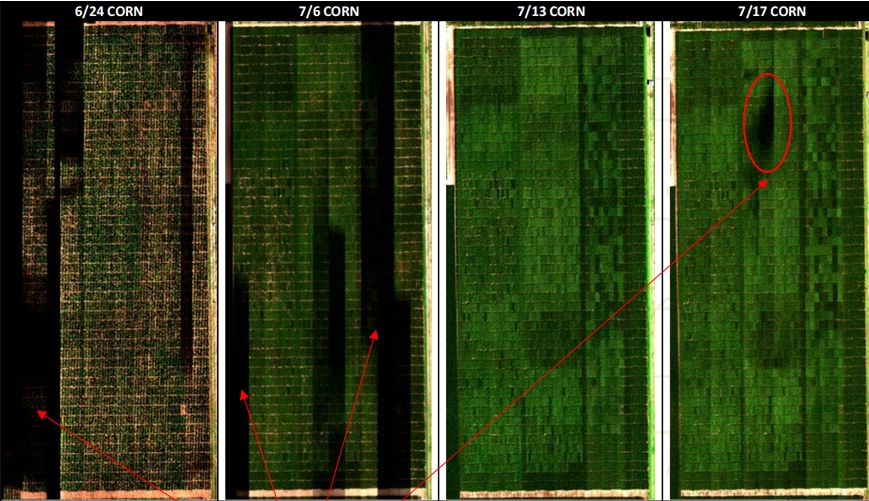 Hyperspectral cameras are very sensitive to lighting conditions and radiometric quality is highly dependent on scene illumination and consistency. To ensure accurate reflectance measurements, illumination in the scene must remain bright and stable throughout data collection. Flights should be conducted within ±2 hours of solar noon under clear sky conditions, when solar radiation and sun angles are optimal. In the winter when sun angles are generally lower, this window should be reduced to as little as ±1 hour from solar noon. See below the impact of a small, short burst of clouds on a hyperspectral data capture. When flights occur outside the solar noon window, long shadows behave much like cloud shading, reducing reflected energy and lowering signal level in the hyperspectral data.