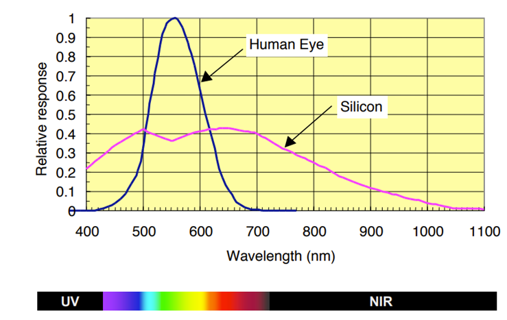 RGB cameras are sensitive to all light in the 350 - 1050nm wavelength spectrum. The human eye primarily sees between 450 - 650nm wavelength spectrum. This does mean an RGB sensor can see greater wavelengths than the human eye. However these cameras filter the light into red, green, and blue wavelengths for constructing the image that is produced.
